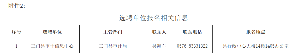 2.报名方式:符合条件的报考人员备齐报名所需材料,在规定时间内至三门县审计局进行现场报名(详见附件2)。报名地点:县行政中心大楼14楼1405办公室,联系电话:0576-83331322。