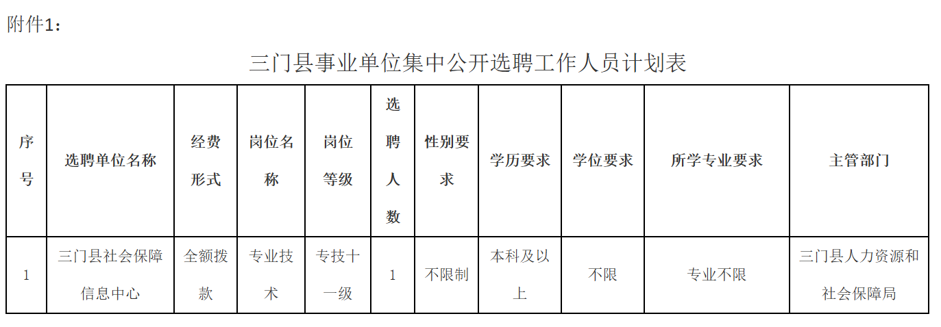 因工作需要,三门县人力资源和社会保障局下属事业单位三门县社会保障信息中心决定在全县范围内选聘全额拨款事业编制工作人员1名。现将有关事项公告如下: