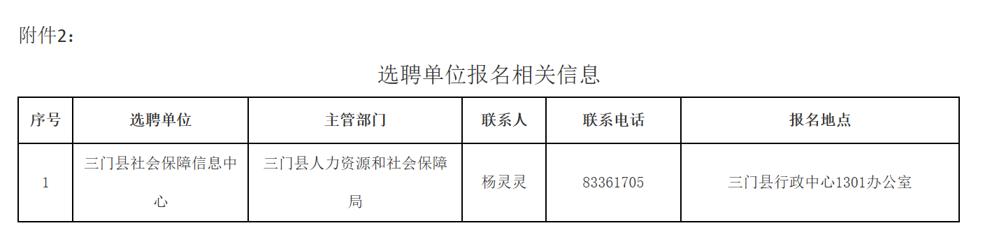 2.报名方式:符合条件的报考人员备齐报名所需材料,在规定时间内至三门县人力资源和社会保障局进行现场报名(详见附件2)。报名地点:三门县行政中心13楼1301办公室,联系电话:83361705。