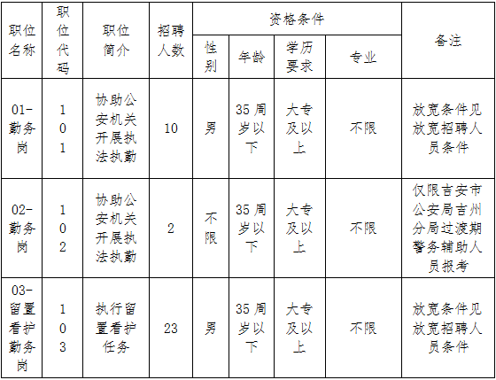 根据工作需要和岗位空缺,面向社会公开招聘辅警35名,其中面向社会招聘辅警33名、面向吉安市公安局吉州分局过渡期警务辅助人员定向招聘2名。具体招聘岗位及人数详见下表。