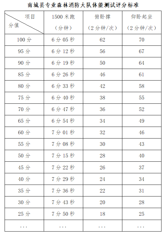 (2)测试项目:仰卧起坐、俯卧撑、1500米,其中1500米占比50%,其余两项各占25%;(详见南城县专业森林消防队员招聘体能测试项目及标准),体能测试项目总分为100分,体能测试合格线为60分。
