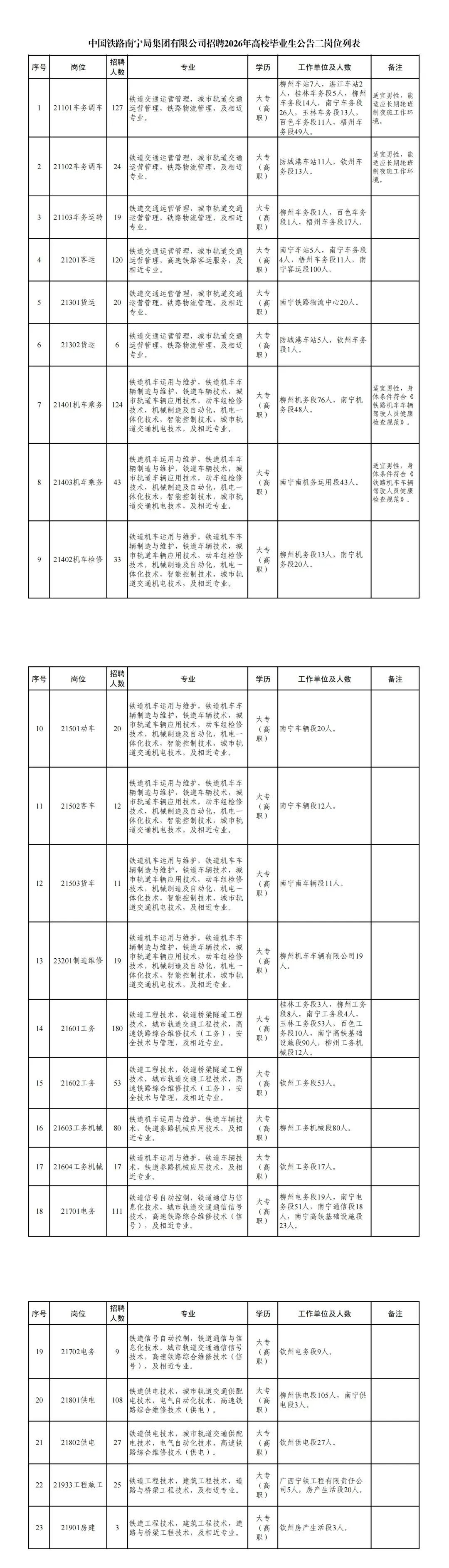 本次计划招聘1191人,具体招聘岗位、专业、人数详见附件《中国铁路南宁局集团有限公司招聘2026年高校毕业生公告二岗位列表》。