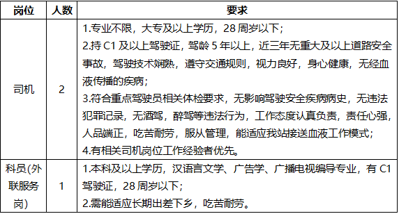 因业务发展需要,赣州市中心血站委托我公司面向社会公开招聘劳务派遣制工作人员3人,并派遣到赣州市中心血站工作,现将有关事项公告如下: