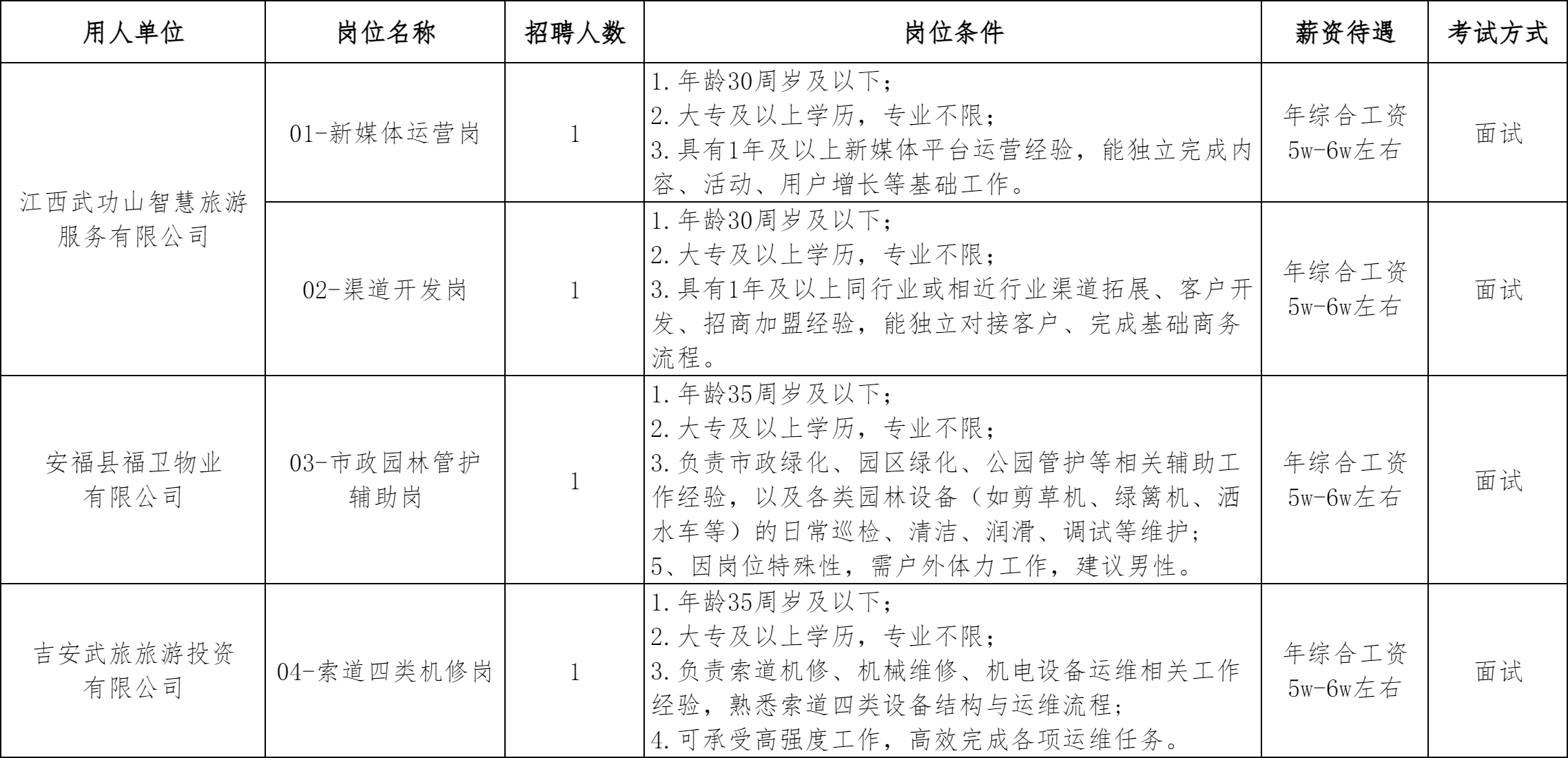 详见附件1《2026年吉安武功山景区开发有限公司面向社会公开招聘劳务派遣人员岗位及任职要求》。本次招聘岗位年龄计算方法为:35周岁及以下是指1990年1月31日(含)以后出生,其他年龄计算方式依此类推。招聘岗位要求毕业证书或资格证书获取的时间截至2026年1月31日(含)。