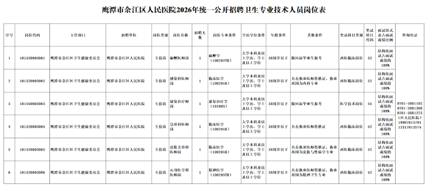 根据事业单位公开招聘有关规定,现将鹰潭市事业单位(余江区人民医院)2026年统一公开招聘卫生专业技术工作人员有关事项公告如下: