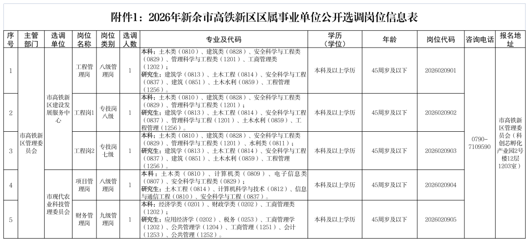 2.选调岗位:八级和九级管理岗位,七级和八级专业技术岗位。详见《2026年新余市高铁新区区属事业单位公开选调岗位信息表》(附件1)。