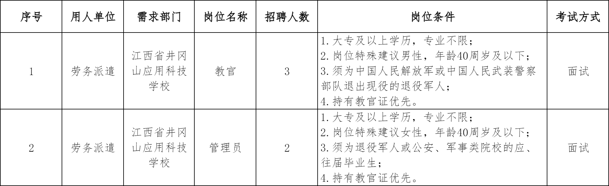 详见附件1《2026年江西省井冈山应用科技学校面向社会公开招聘5名劳务派遣工作人员岗位及任职要求》。本次招聘岗位年龄计算方法为:40周岁及以下是指1985年1月31日(含)以后出生,其他年龄计算方式依此类推。招聘岗位要求毕业证书或资格证书获取的时间截至2026年1月31日(含)。特别优秀者经研究决定后可适当放宽相关条件。