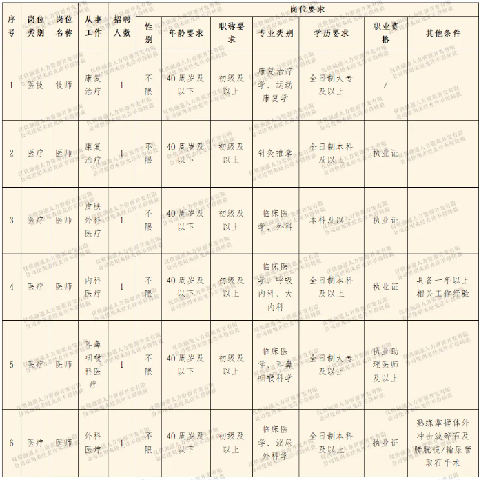 2、身体条件:身心健康、五官端正、外露体表无纹身、言行举止得体、无不良嗜好;符合岗位要求的身体心理素质;3、学历条件:具有国家承认的招聘岗位所需专业的学历、专业知识及业务能力,医师岗有住院医师规范化培训合格证明的优先考虑;4、资格条件:医师岗须取得执业医师资格证以及相关岗位要求的专业技术资格证书,技师岗须取得相应专业技术资格证书;5、具有下列情形之一的,不得参加报考:(1)曾受过刑事处罚或被开除过公职的;(2)因涉黄、涉赌、涉毒或聚众斗殴、敲诈勒索、非法拘禁等受到行政处罚的;(3)加入邪教组织、组织或参与非法宗教活动的;(4)受党纪、行政处分或被诫勉谈话,处分期或影响期未满的;(5)因涉嫌违法违纪,正在接受审查的;(6)有恶意失信行为被法院纳入失信被执行人名单的;(7)煽动群众闹事、扰乱公共秩序,或道德品行低劣、在群众中影响较坏的;(8)其他原因不适宜报考的人员。