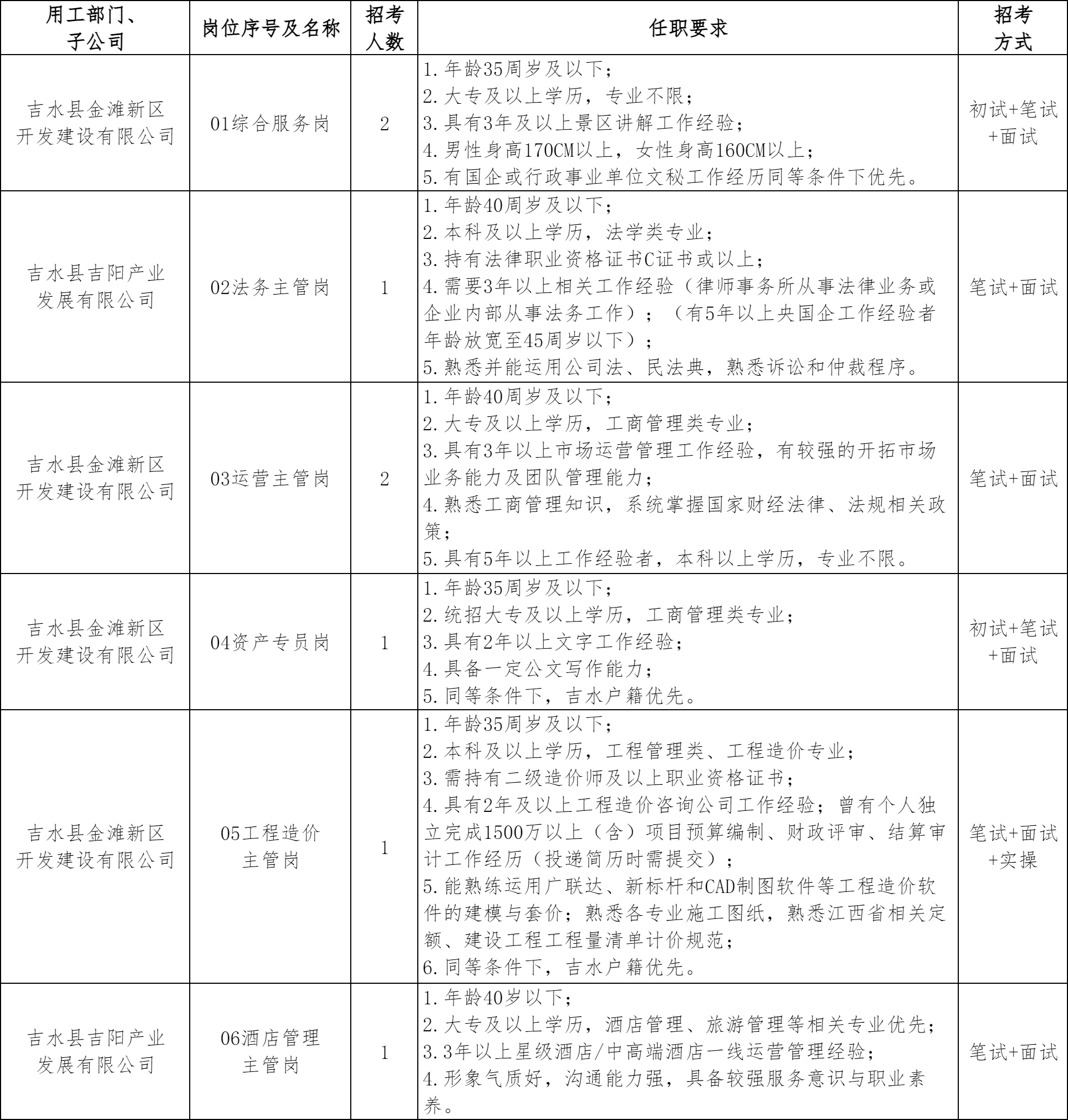 本次招聘共6个岗位,共计招聘8人,详见附件《吉水县吉阳产业发展有限公司及下属子公司2026年第二批招聘岗位及任职要求》。本次招考年龄计算方法为:35周岁及以下是指1991年3月1日(含)以后出生,40周岁及以下是指1986年3月1日(含)以后出生,45周岁及以下是指1981年3月1日(含)以后出生。招聘岗位要求毕业证书或资格证书获取的时间截至2026年3月1日(含)。特别优秀者经研究决定后可适当放宽相关条件。