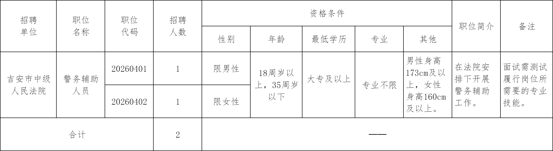 此次计划招聘辅警2名,具体招聘职位、人数、资格条件等详见《2026年吉安市中级人民法院公开招聘警务辅助人员职位表》(附件1)。