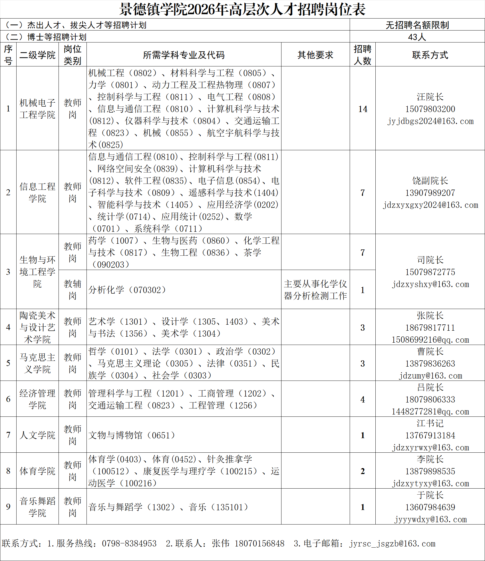 杰出人才、拔尖人才无招聘名额限制,博士研究生招聘计划43名,具体招聘岗位及要求详见《景德镇学院2026年高层次人才招聘岗位表》(附件1)。