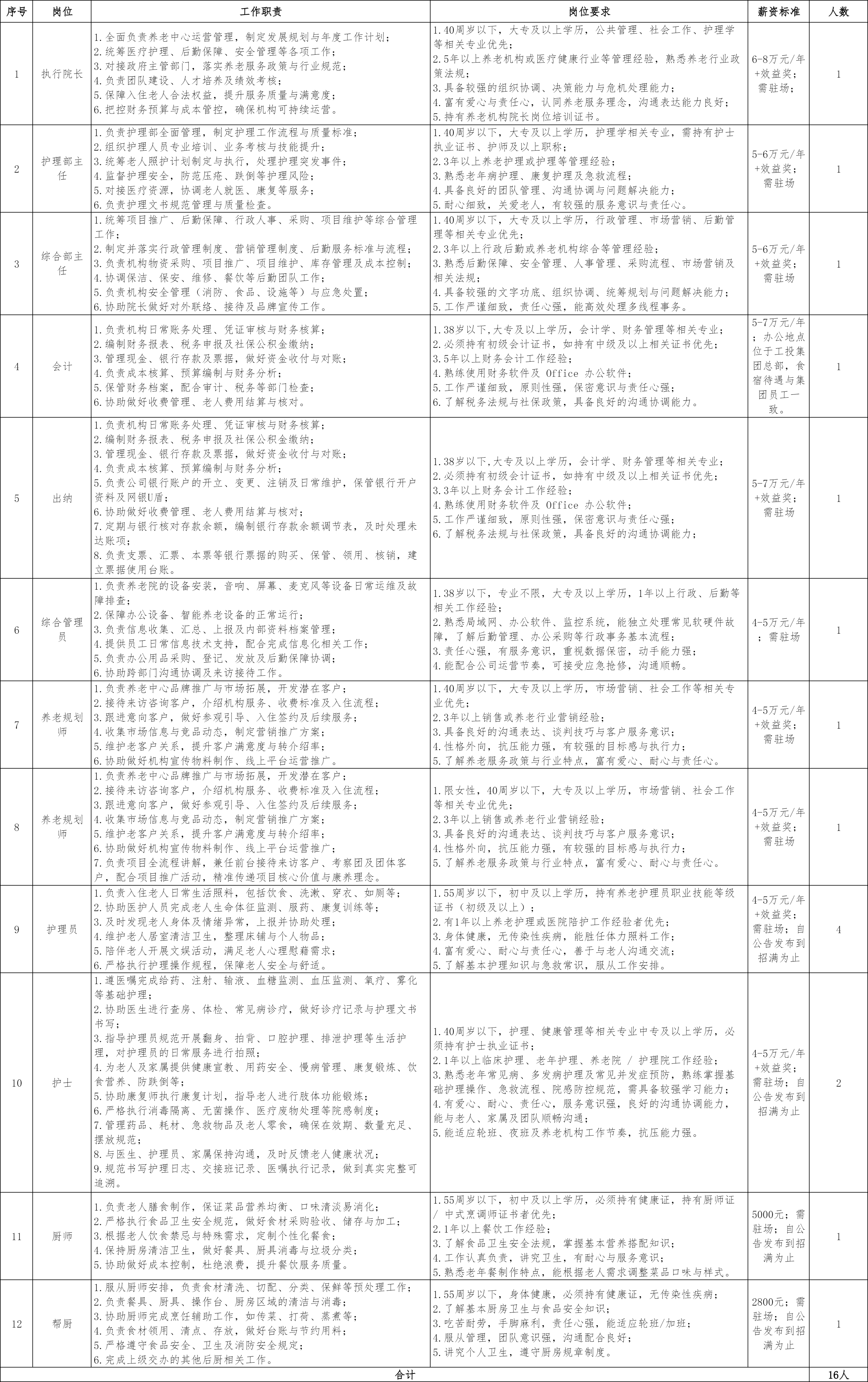 泰和县工投建设集团有限公司是经县委、县政府批准成立的国有独资企业,其下属泰和县康寿养老服务有限公司成立于2025年,是一家以养老服务、护理机构服务、康养服务为主的企业。根据公司业务发展需求,决定面向社会公开招聘16名工作人员,现就有关事项拟定如下招聘方案: