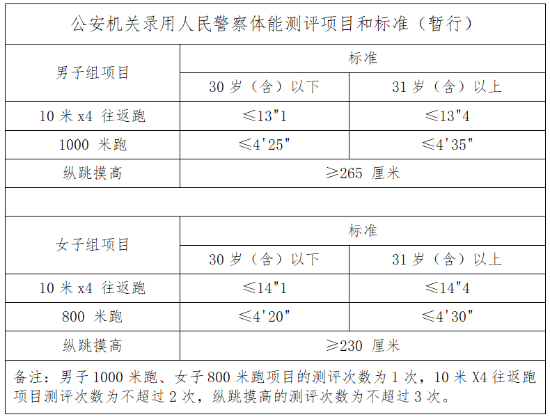(二)体能测试项目为:男子1000米跑/女子800米跑、10米×4往返跑、纵跳摸高。体能测试采取达标制,三项考核项目需全部达标才能进入面试环节。标准按照《公安机关录用人民警察体能测评项目和标准(暂行)》执行,见下表。
