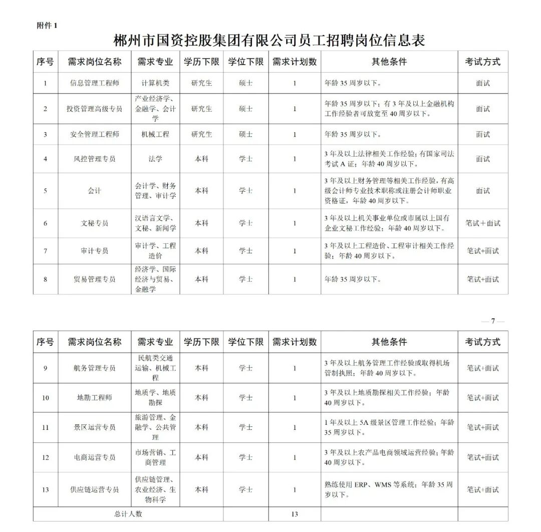 本次面向社会公开招聘13人,具体岗位及相关要求详见附件1(郴州市国资控股集团有限公司员工招聘岗位信息表)。