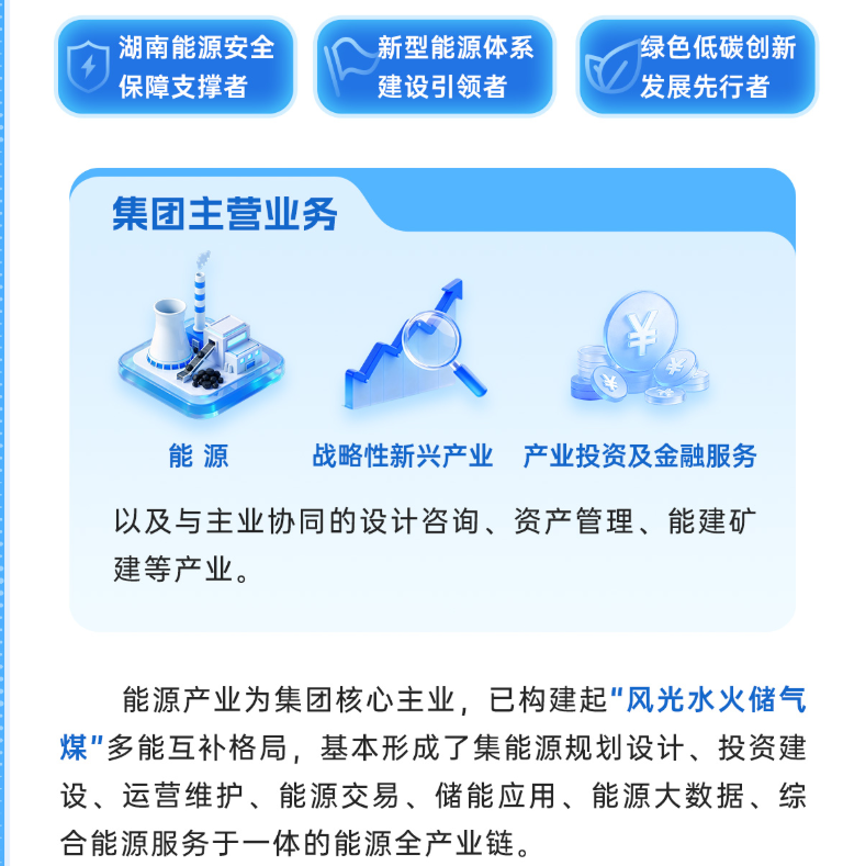 湖南能源集团注册资本300亿元,定位为湖南省综合性能源保障主平台和全省能源战略实施主体。在省委、省政府统筹部署下,落实全省能源发展战略,承担全省能源保供功能性任务,落实省内能源资源开发任务,承接重大能源项目投资建设,代表湖南省开展省内外重大能源项目合作。