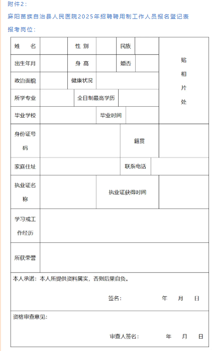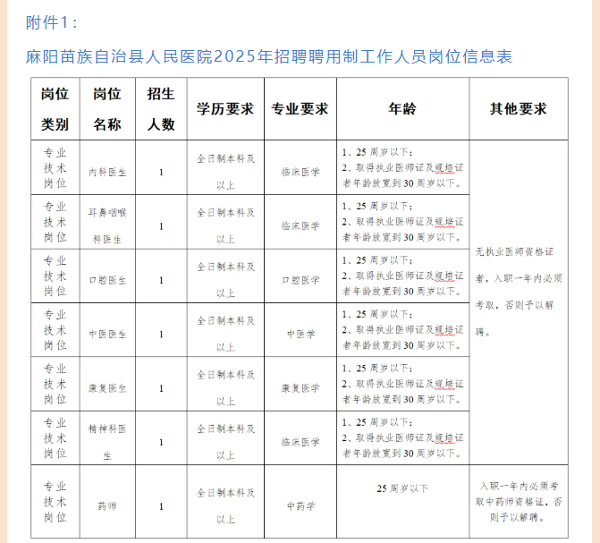 5.各岗位年龄、学历、专业、执业要求等详见《麻阳苗族自治县人民医院2025年招聘聘用制工作人员岗位信息表》(附件1)。