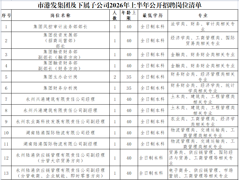 招聘岗位的具体条件及要求详见附件1《永州陆港枢纽投资发展集团有限公司2026年上半年公开招聘岗位清单》。