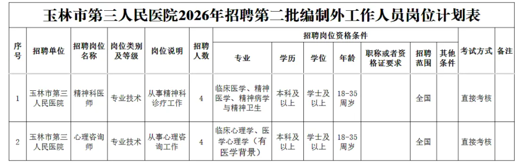 玉林市第三人民医院始建于1956年,2006年在玉林铁路医院的基础上组建玉林市第三人民医院,隶属市卫生健康委员会。2024年与玉林市第一人民医院建立紧密型城市医疗集团,是集医疗、预防、康复、科研、保健和教学功能为一体的国家二级甲等综合性医院,是玉林市城南片区最大的公立医院。目前是玉林市基本医疗保险定点医院,已开通玉林市、玉州区、玉东区、福绵区、陆川县、博白县、兴业县、容县、广西区办理异地到我院就医的职工、城乡居民医保直报业务,大大方便群众看病就医。医院全体员工秉承“厚德精医大爱无疆”的院训,以“民众健康是我们取舍的根本”,追求“奉献仁爱敬业担当”价值观,实现“争做健康服务行业典范,打造区域标杆医院”的目标。根据医院业务发展需要,玉林市第三人民医院公开招聘编制外人员8名,现将有关事项公告如下: