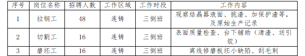 1、愿意从事钢铁生产作业工作,初中毕业及以上,年龄18-45岁,身体健康,无职业禁忌;