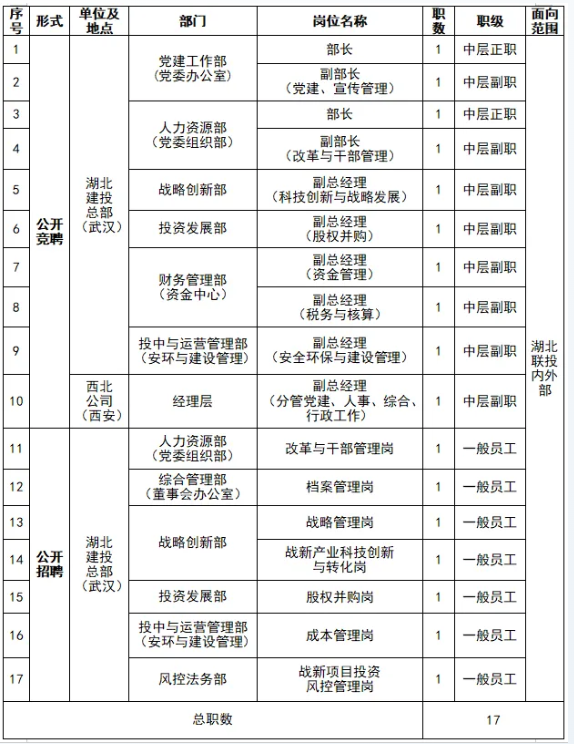 为落实湖北联投深化改革推进会部署及“人力资源更新十条”和“干部素质提升年”要求,践行“人才强企”战略,拓宽选人用人渠道,根据实际工作需要,湖北省建设投资集团有限公司(以下简称“湖北建投”)拟开展部分中层管理人员及员工岗位公开竞聘、招聘工作。