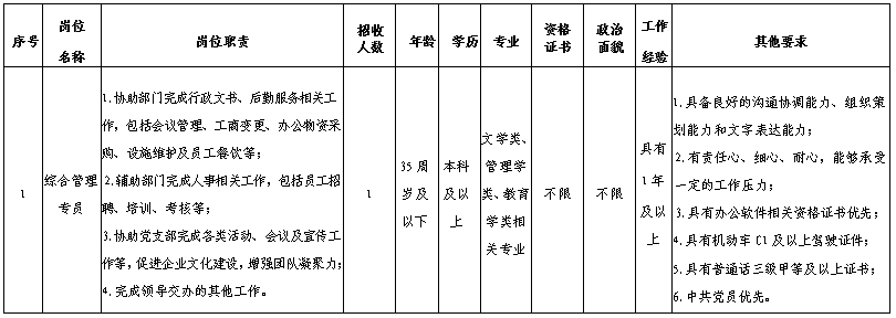 因公司业务扩展需要,我司决定面向社会招聘1名综合管理专员,用工性质为劳务外包,现将有关事项公告如下: