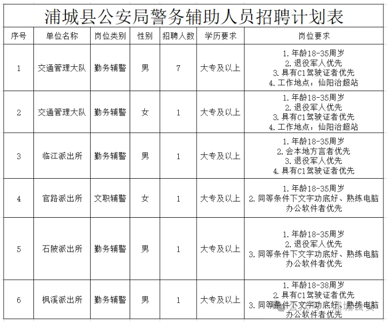 因工作需要,浦城县公安局招聘12名警务辅助人员(警务辅助人员是指为公安机关警务活动及相关工作提供辅助支持的非人民警察身份的编外人员,以下简称“辅警”),现将有关事项公告如下: