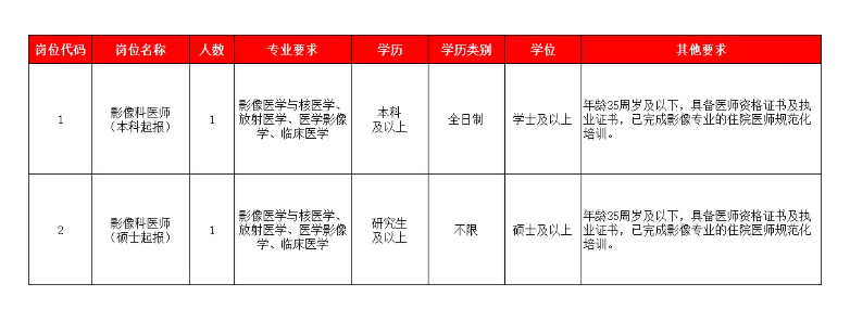 2.影像科医师(硕士起报):年龄35周岁及以下,研究生及以上学历,硕士及以上学位,影像医学与核医学、放射医学、医学影像学、临床医学专业,具备医师资格证书及执业证书,已完成影像专业的住院医师规范化培训。