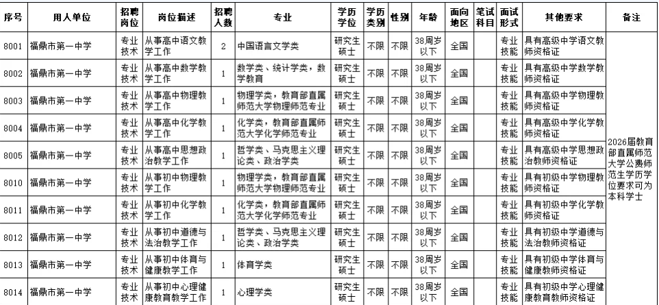 3.材料要求:《2026年福鼎市教育局公开招聘紧缺急需人才报名表》(附件),教师资格证书(或考试合格证明)pdf版,本科及硕士学历学位证书pdf版,学历及学位的学信网在线验证报告pdf版,境外学历需提供教育部留学服务中心出具的有效证明材料pdf版,部属公费师范生证明pdf版,以上材料打包,以“姓名+报考岗位”命名发送至邮箱3612293137@qq.com,同步发送福鼎一中邮箱fdyzbgs2022@163.com。