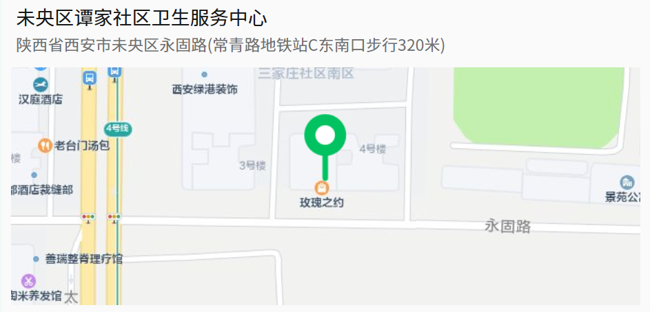 西安市未央区谭家社区卫生服务中心成立于2009年7月,位于未央区永固路三家庄社区南区南门,是未央区卫健局直属的一所非营利性社区卫生服务机构。中心服务人口约13万余人,服务范围17平方公里。