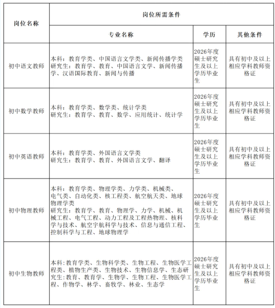 为进一步加强我校教师队伍建设,充实教师队伍力量,优化教师结构,拟对外公开招聘语文、数学、英语、生物、物理学科教师,具体岗位如下: