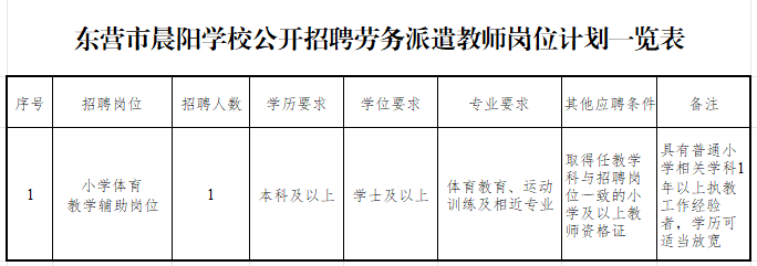 因工作需要,东营市晨阳学校委托东营市东凯人力资源服务有限公司面向社会公开招聘劳务派遣教师,现将有关事项公告如下: