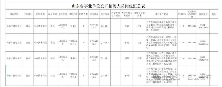 根据省属事业单位公开招聘有关规定,结合工作需要,山东广播电视台面向社会公开招聘中级专业技术岗位人员9人、初级专业技术岗位人员6人。具体岗位及条件详见《山东省事业单位公开招聘人员岗位汇总表》。
