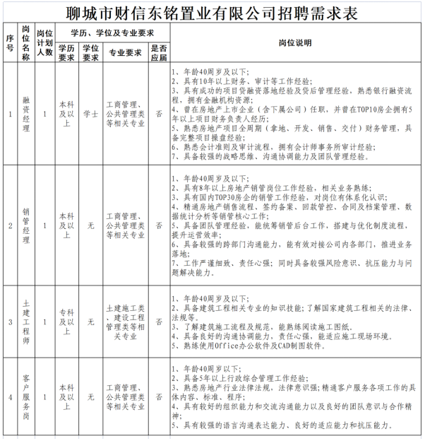 聊城市财信东铭置业有限公司(简称“东铭置业”),注册资本壹仟万,是隶属于聊城市财信城市发展有限公司的国有控股子公司,主营业务为房地产开发经营、各类工程建设活动、建筑物拆除作业(爆破作业除外)、住房租赁、非居住房地产租赁、物业管理、园林绿化工程施工、房地产咨询、市政设施管理等。现为满足公司发展和工作需要,特面向社会公开招聘优秀人才,现将招聘事项公告如下:
