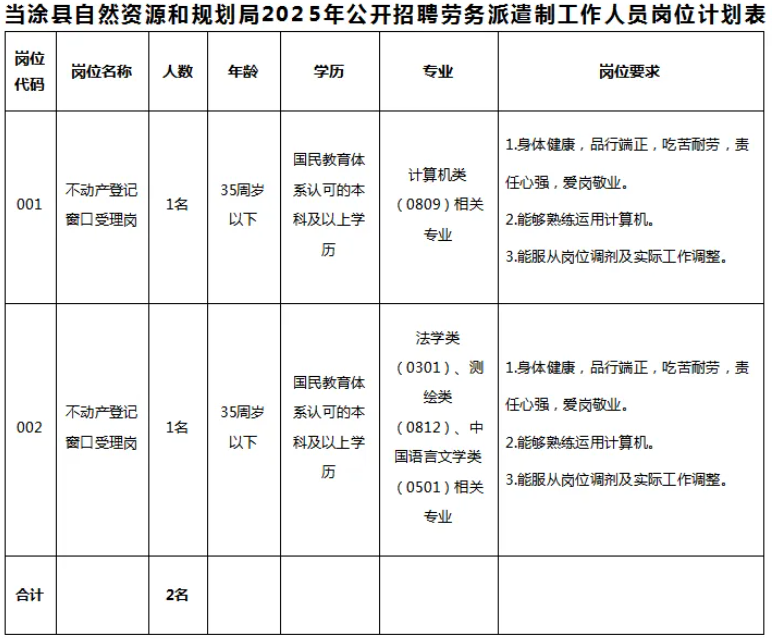 2.符合《当涂县自然资源和规划局2025年公开招聘劳务派遣制工作人员岗位计划表》(附件)规定的岗位学历、专业、年龄、岗位要求等基本条件,其中“35周岁以下”为“1989年10月25日(含)以后出生”。