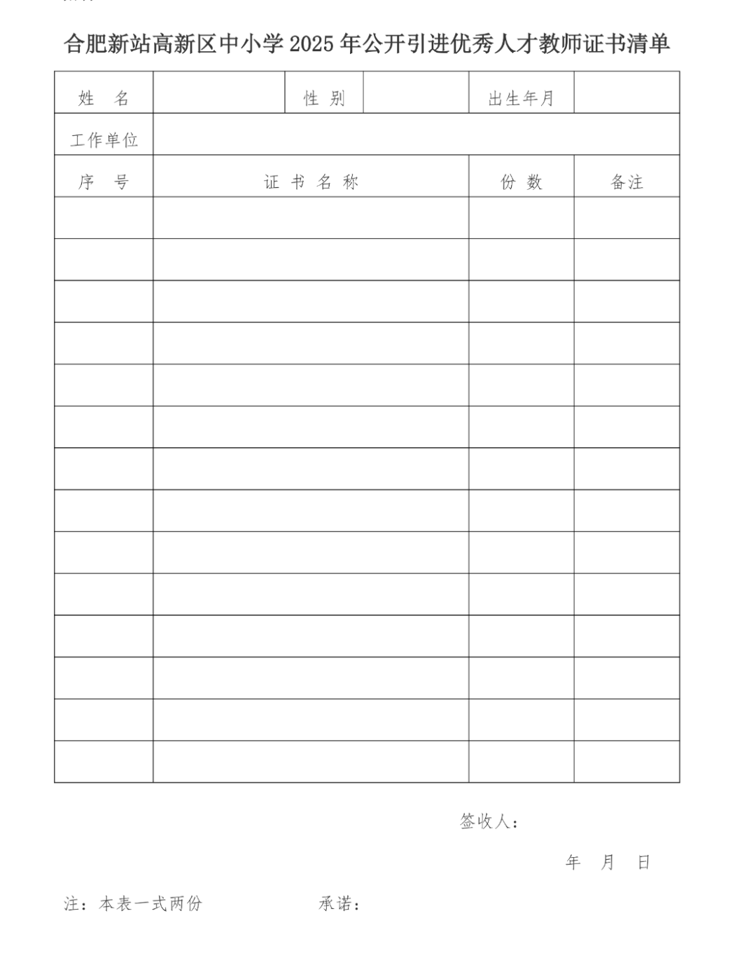 现场报名需提供材料:需提前下载并填写《合肥新站高新区2025年公开引进中小学优秀教师报名表》(附件1),同时携带符合报考条件的相关证明材料原件及复印件各一套,包括有效身份证、学历证书、教师资格证书、资质获奖证书或荣誉证书,以及《合肥新站高新区中小学2025年公开引进优秀人才教师证书清单》(附件2)。此外,在编人员还须提供所在事业单位及主管单位同意报考的证明(见附件3)。