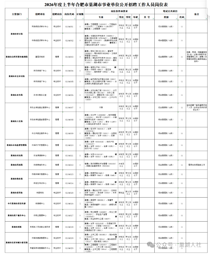 根据《事业单位人事管理条例》《安徽省事业单位公开招聘人员暂行办法》等有关规定和要求,现就2026年度上半年合肥市巢湖市事业单位公开招聘工作人员有关事项公告如下: