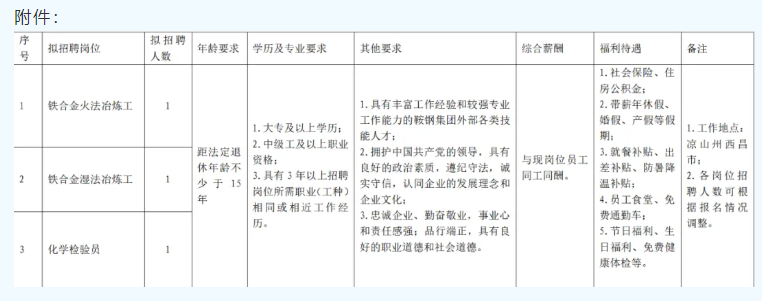西昌钒制品通过官方网站、微信公众号、第三方引进机构等平台发布招聘信息,明确引进岗位、条件以及工作地点、薪酬福利等内容。
