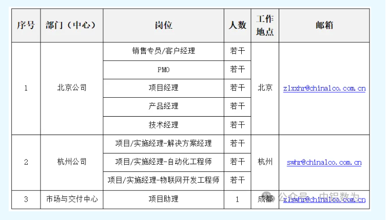 中铝数为(成都)科技有限责任公司(简称中铝数为)是中国铝业集团有限公司(简称中铝集团)全资子公司,是中铝集团数字化转型的承载主体,主要业务包括应用软件、云计算、信息安全技术的开发及技术服务;计算机信息系统集成及相关服务;智能装备、自动化设备、检测设备、仪器仪表、机器人的研发及技术咨询服务;数字化系统运维服务;数字化项目实施等。根据工作需要,现面向社会公开招聘部分岗位人员,现将有关事项公告如下: