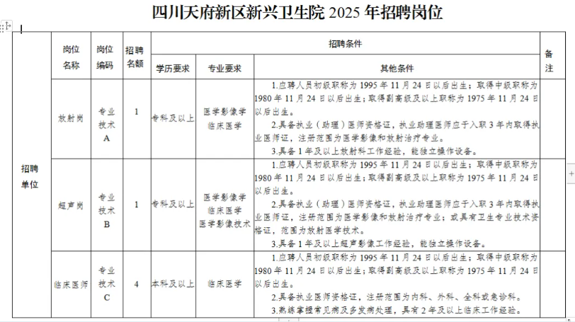 3.所需材料。应聘者本人携带工作简历、二代身份证、学历学位证(包含学信网上学历学位证书电子注册备案表)、执业证书、专业技术资格证等相关材料原件及复印件一套,到四川天府新区新兴卫生院综合办公室登记报名。