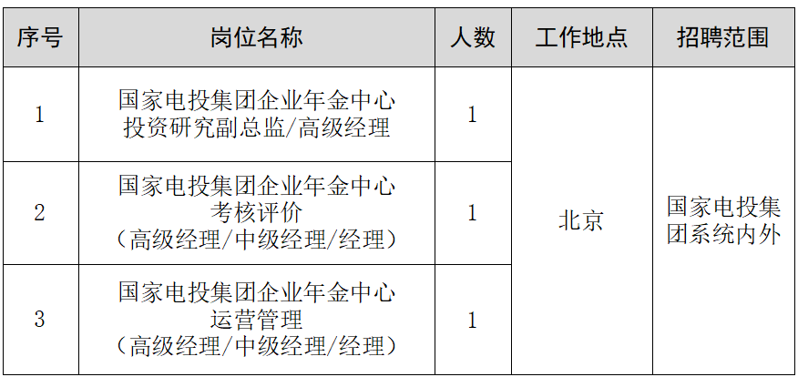 国家电投集团企业年金中心是国家电投集团服务保障中心,总部部门级,是国家电投集团企业年金日常运营主体、年金管理服务和考核监督平台。现根据工作需要,面向国家电投集团系统内、外公开招聘3个岗位,共计3人,具体事项公告如下: