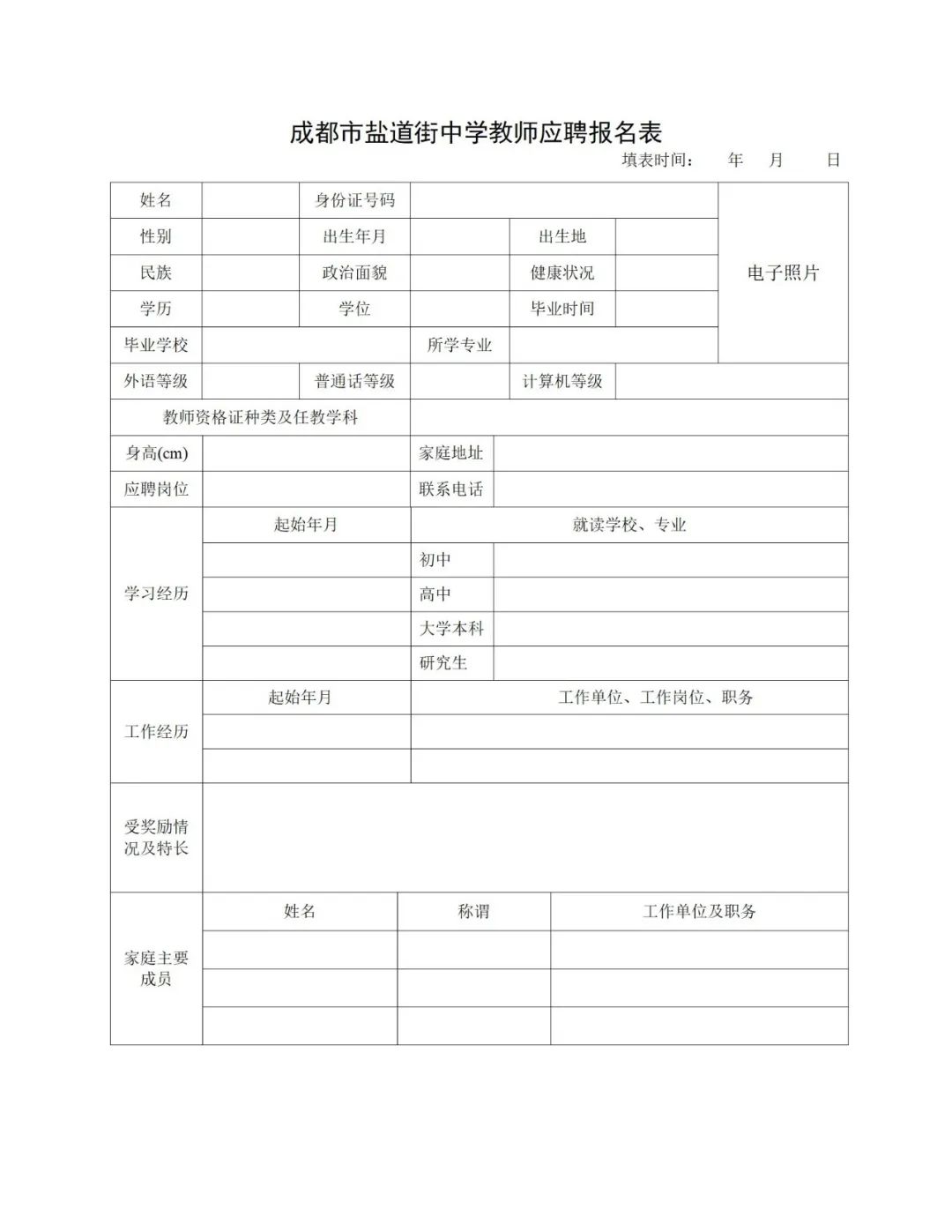 请有意应聘者填写《成都市盐道街中学教师应聘报名表》(请务必下载此表填报信息,如不能下载,可参考截图自做一份),以附件形式发到指定邮箱,邮件主题为:应聘岗位+姓名+报名表
