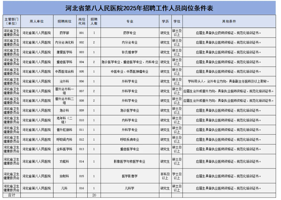 为满足医院发展需求,有效配置人力资源,根据《河北省事业单位公开招聘工作人员暂行办法》相关要求,结合医院实际,拟招聘20名工作人员。