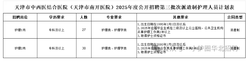 二、招聘条件(一)报考人员应具备以下条件1.遵守宪法和法律,具有良好的品行;2.具有适应岗位要求的身体条件,能正常履职;3.热爱卫生健康事业,严格遵守职业道德规范;4.具有岗位所需的专业、技能及扎实的本专业理论知识,就业观念端正,服从分配;5.具有符合岗位要求的学历及相应学位(持有香港、澳门、台湾和国外院校毕业证书的人员,所学内容要与岗位需求相一致,且需出具教育部门的学历认证);6.各招聘岗位所需的具体资格条件详见《天津市中西医结合医院(天津市南开医院)2025年度公开招聘第三批次派遣制护理人员计划表》。(二)凡有下列情形之一者,不得报考1.受过刑事处罚或正在接受立案审查的;2.尚未解除党纪、政纪处分的;