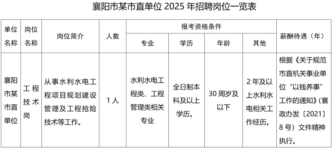 根据《襄阳市某市直单位2025年社会化聘用工作人员工作方案》文件精神,为规范做好2025年社会化聘用工作人员工作,现面向社会公开招聘工程技术岗1名,具体事项公告如下:
