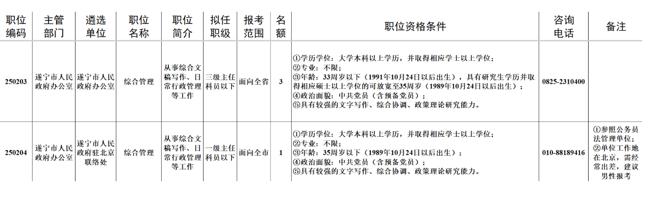 其他职位面向遂宁市内机关(单位)已进行公务员登记且在编在岗符合条件的公务员遴选(考调)。中央机关、省级机关设在遂宁市内的单位(包括垂直管理单位、派出单位等)中符合条件的人员也可报考。