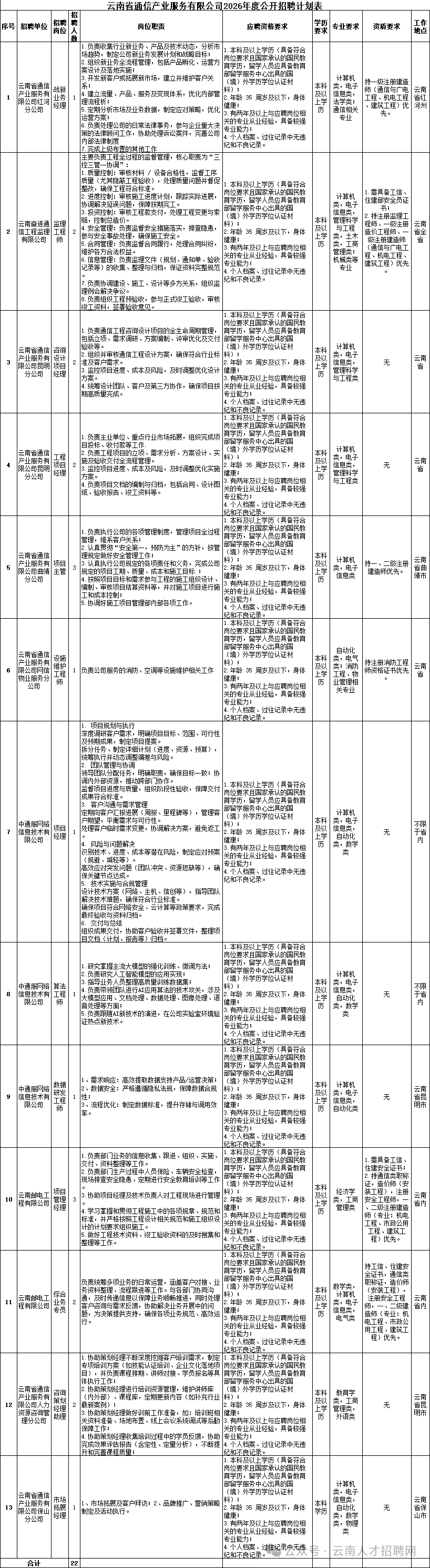 2.各招聘岗位资格条件详见《云南省通信产业服务有限公司2026年度社会公开招聘计划表》附件1。
