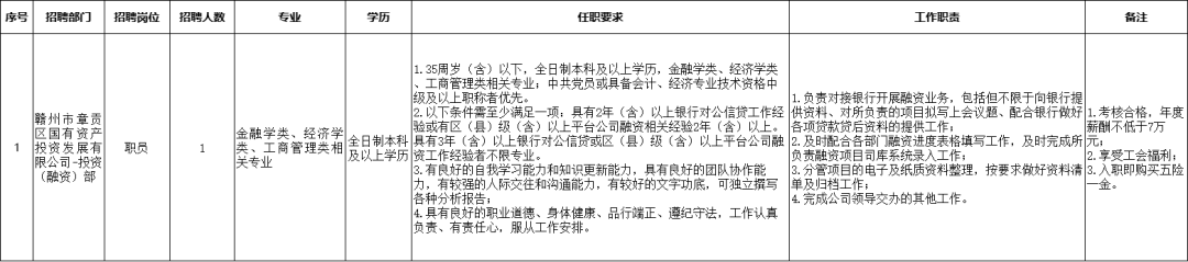 赣州市章贡区国有资产投资发展有限公司(以下简称“章贡国投”)是赣州市章贡区直接管理的国有企业。近年来,在章贡区委、区政府的坚强领导下,秉承"做大国有资产、做优数字经济、做强资本运营"的使命,不断优化资源配置,促进转型升级,在数字信创经济、农贸市场运营、资本运营等新型产业板块同向发力,增强公司实力,在服务章贡区发展大局上担当新使命、展现新作为。现因业务发展需要,决定面向社会公开招聘1名工作人员,并委托我方承接该招聘业务,现将有关事项公告如下。
