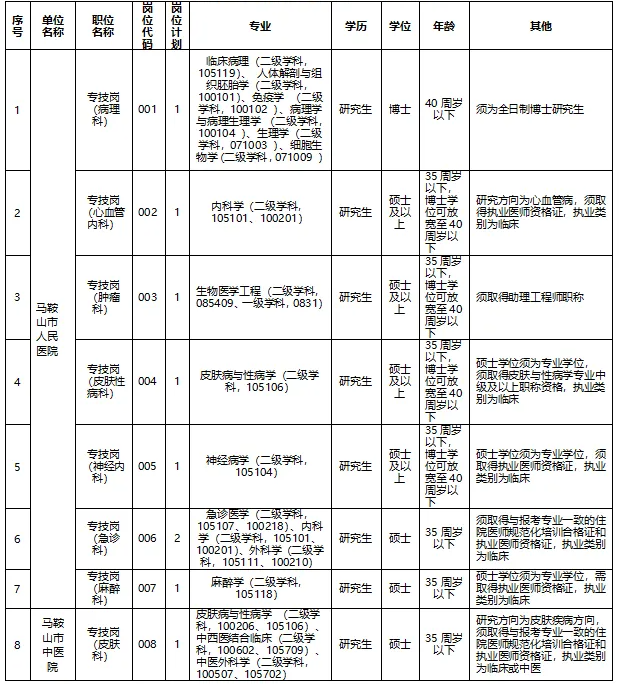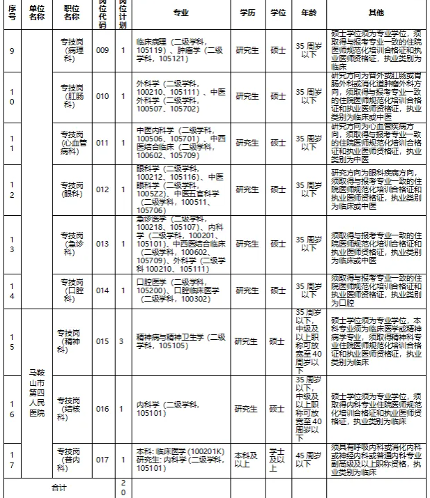 马鞍山市医疗卫生事业单位 面向社会公开招聘工作人员20人公告
