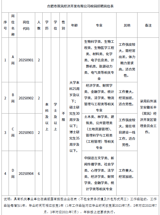 具体招聘人数及相关专业、岗位要求等,详见《合肥市双凤经济开发有限公司校园招聘岗位表》。招聘条件如下: