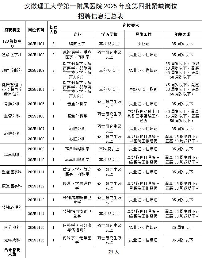 根据医院工作需要,经院部研究,现招聘紧缺岗位医疗专业技术人员21名。